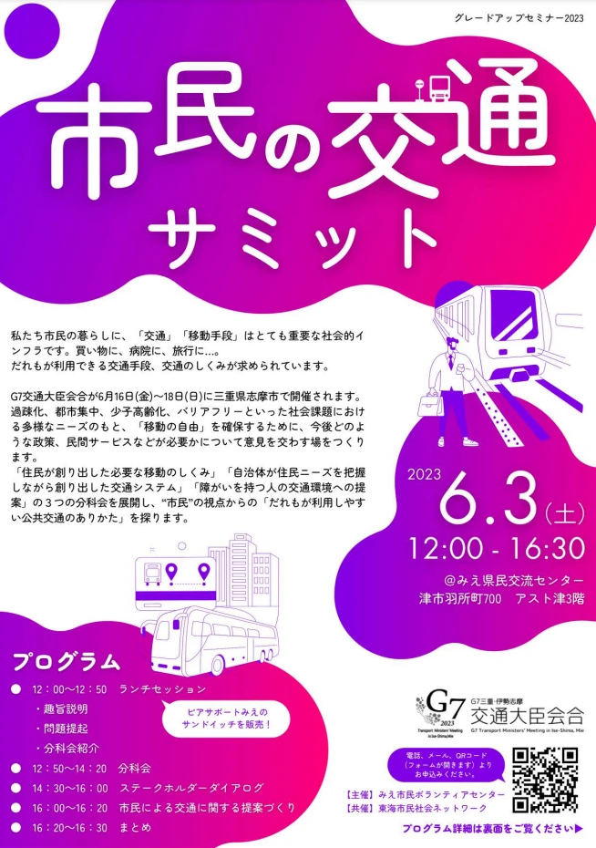 G7市民社会コアリション2023会員の東海市民社会ネットワークが共催するイベント「市民の交通サミット すべての人の『移動の自由』が保障されるまちをつくる」が、G7三重・伊勢志摩交通大臣会合に先立つ2023年6月3日、三重県にて開催されます。ぜひご参加ください。