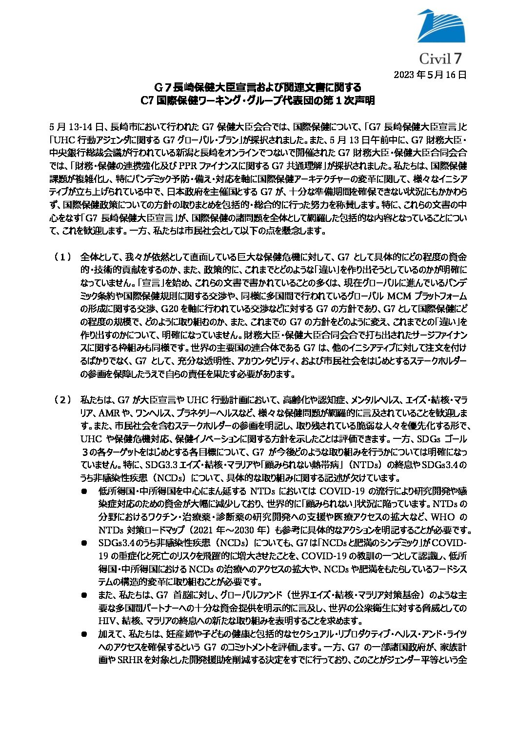 C7(市民7)国際保健ワーキンググループ、 G7長崎保健大臣会合成果文書に対する第1次声明を発表